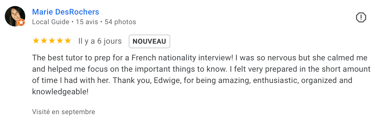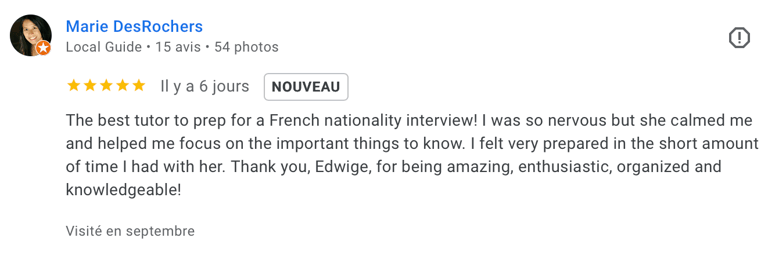 J'ai suivi le cours de préparation à l'entretien d'assimilation avec Edwige. Pendant quelques semaines de cours, dans un petit groupe avec d'autres participants, nous avons regardé les principaux sujets à connaître pour l'entretien (politique française, valeurs, histoire, société, géographie). Les cours d'Edwige sont très bien conçus, il est donc facile de les suivre. Edwige est également très sympathique, ouverte et passionnée par les sujets abordés. Même si je me préparais à un entretien important, j'ai eu l'impression d'être très bien préparée grâce à toutes les informations que j'ai reçues d'Edwige. Je recommande vivement Edwige et son expertise à toute personne qui envisage de se préparer à un entretien et ne sait pas par où commencer.